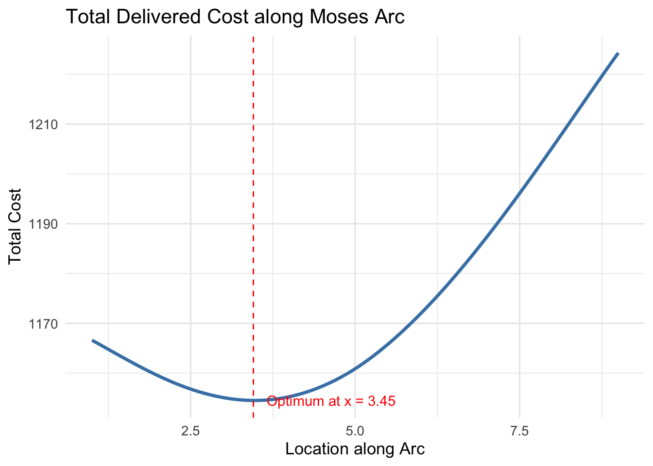annotate("text", x=optimal_location + 0.2, y=min(df$total_cost),