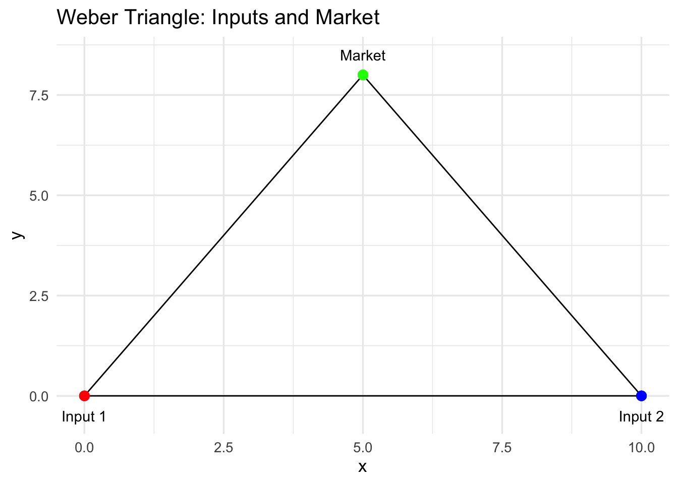 We visualise the classical Weber triangle, showing the locations of the two inputs and the market. This provides a geometric reference for understanding the firm’s trade-offs and for illustrating the Moses arc later.