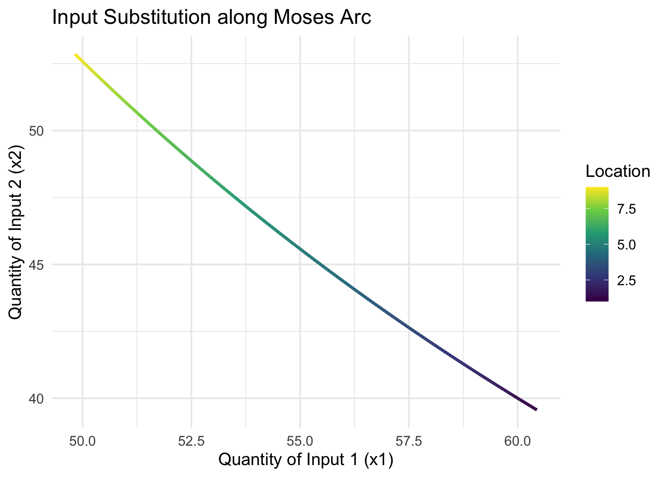 Here, we plot \(x_1\) versus \(x_2\) along the arc to show how the input mix changes with location. This makes the substitution logic tangible, showing students how moving along the arc affects the combination of inputs used.