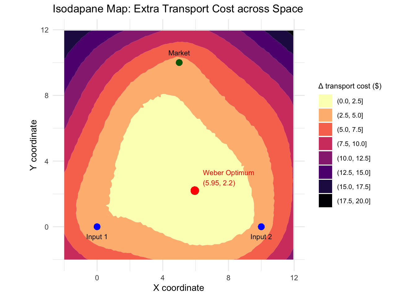Weber’s world is intentionally stylized. It omits substitution, agglomeration, and diseconomies, which later models (like Moses’s) incorporate. Yet this simplicity allows us to isolate the spatial minimization of cost. Real economies overlay this logic with clustering effects, congestion, and uneven transport networks, but the underlying principle remains Weberian in many respects.